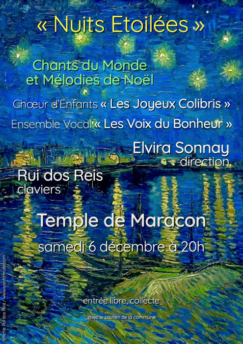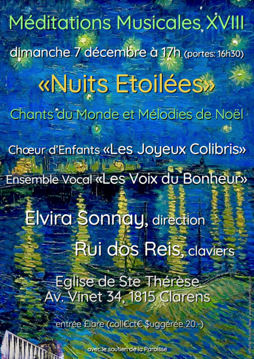 Le chœur d’enfants « Les Joyeux Colibris » et l’ensemble vocal « Les Voix du Bonheur » placés sous la direction d’Elvira Sonnay et accompagnés au claviers par Rui dos Reis vous emporteront dans un voyage à travers des « Nuits Etoilées » constellées de chants du Monde et de mélodies de Noël.
