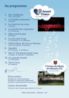 Placé sous la direction du Maestro Frédéric Jochum, l’ensemble vocal mixte « Amont Chœur » donnera son concert annuel avec un programme très varié. Au piano: Rui dos Reis. En deuxième partie, ils ont invité « I Ticines da Minüs ». Une soirée qui sera haute en couleurs vocales.