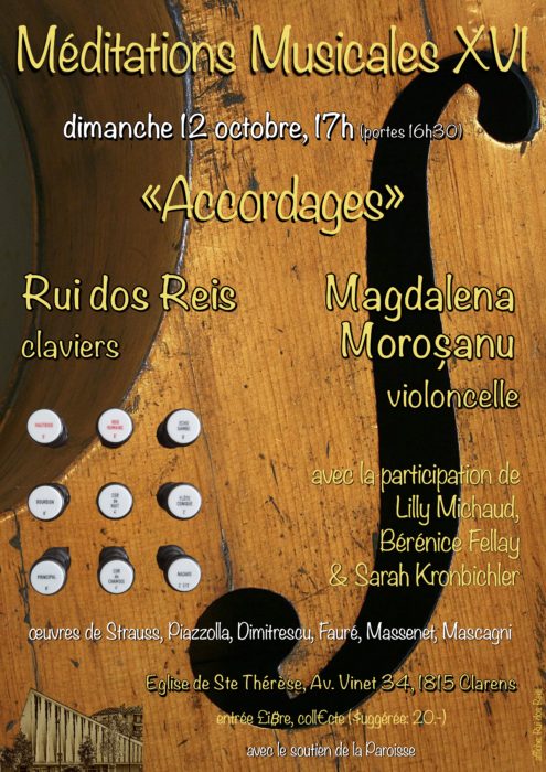 Pour ce XVIè volet des « Méditations Musicales », nous vous présentons « Accordages » avec la violoncelliste Magdalena Moroșanu, accompagnée par Rui dos Reis et avec la participation de Lily Michoud, Bérénice Fellay et Sarah Kronbichler.