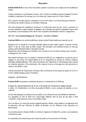 Des peintures abstraites d’Isabella Beffa-Paul, projetées sur grand écran, ainsi que des poèmes de sa plume et des musiques choisies prendront vie grâce aux talents de Lauriane Beffa, voix, et François Beffa, piano.