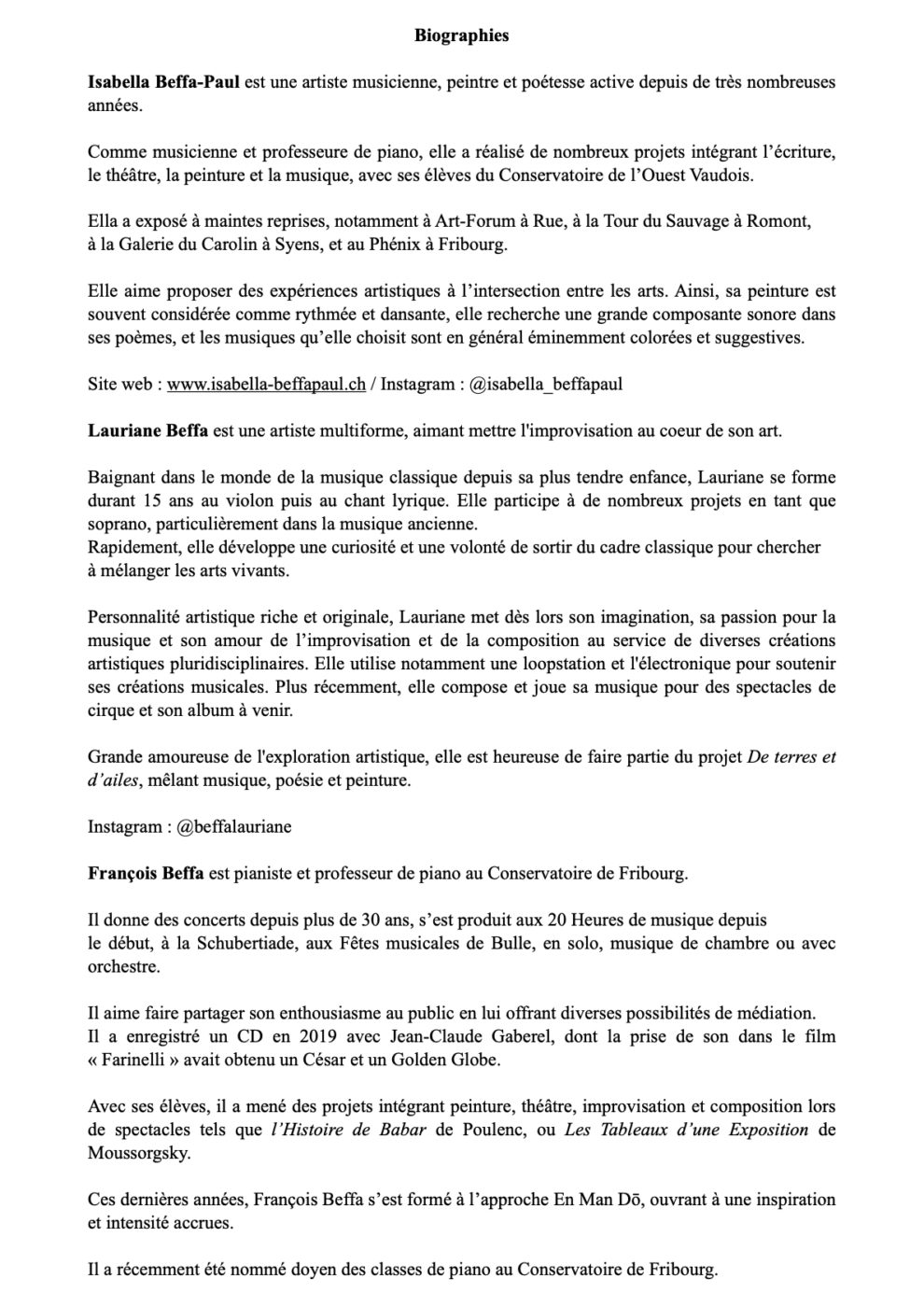 Le 16 novembre, nous accueillerons l’artiste-peintre, musicienne et poétesse Isabella Beffa-Paul, François Beffa, pianiste et Laurianne Beffa, voix, qui nous enchanterons avec leur spectacle « De Terres et d’Ailes ».